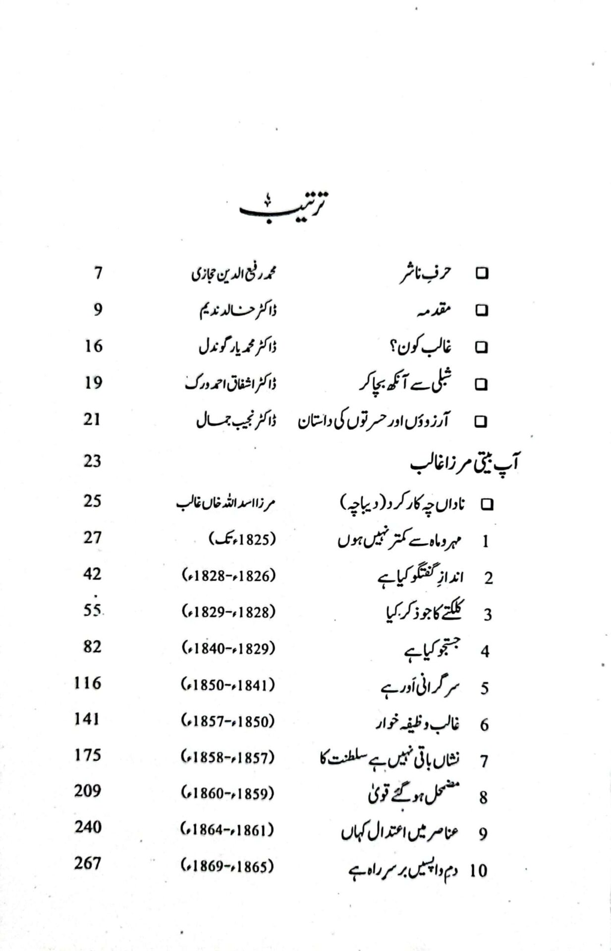 باب نمبر10 دم واپس برسر راہ ہے میں غالب کے وقت آخر کی تفصیل ملتی ہے ۔ ڈاکٹر خالد ندیم کی صبح و شام کی محنت ادب سے محبت ایسا رنگ لائی جو قاری کی روح کو بالیدگی بخشتا ہے اور ڈھیر ساری معلومات کے در وا کرتا ہے۔ کتاب سال رواں کا بہترین تحفہ ہے۔