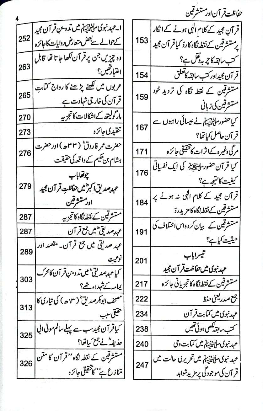 قرآن مجید کے کلام ِ الہی ہونے سے انکار پر مستشرقین کے نقطہ نگاہ کا رد کیا گیا ہے. اسی طرح عہدِ نبوی میں حفاظتِ قرآن اور مستشرقین کے نقطہ نگاہ کا تجزیاتی جاٸزہ بھی لیا گیا ہے اور عہد نبویﷺ میں تحریری حالت میں قرآن کی موجودگی پر مزید شواہد دیے گے ہیں. عہدِ صدیقی، عہدِ فاروقی،عہدِ عثمانی میں جمعِ قرآن اور ترتیبِ قرآن مجید کے بارے میں امتِ محمدیہ کا مٶقف اور مستشرقین کی آرا ٕ نسخ فی القرآن کی بنیاد پر مستشرقین کے صحتِ قرآن پر اعتراضات اور امت محمدیہ کے دلاٸل سبعہ قرات اور مستشرقین اختلافِ مصاحب اور مستشرقین اور ان کا تنقیدی جاٸزہ ، صحتِ قرآن پر مستشرقین کے متفرق اعتراضات ان کا جاٸزہ ، واقعہ غرانیق اور اس کی حقیقت صحتِ قرآن مجید پر خارجی شواہد قرآن مجید کی زبان کا تاریخی تسلسل، تلاوت قرآن مجید کا تسلسل اور ترغیب تلاوت قرآن
