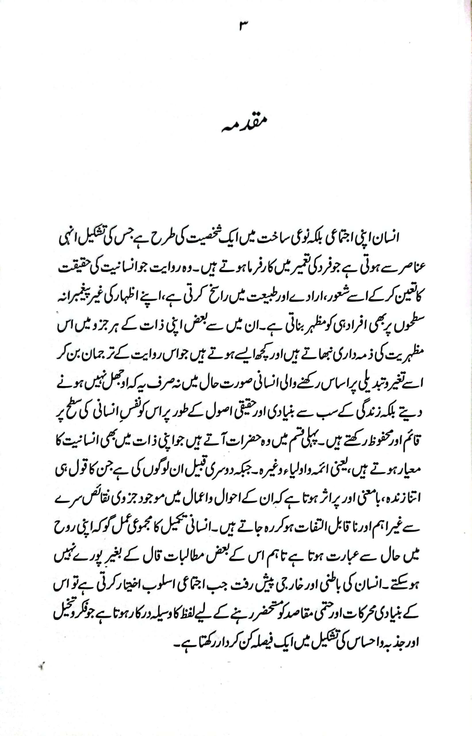 انسان اپنی اجتماعی بلکہ نوعی ساخت میں ایک شخصیت کی طرح ہے جس کی تشکیل انھی عناصر سے ہوتی ہے جو فرد کی تعمیر میں کارفرما ہوتے ہیں۔ وہ روایت جو انسانیت کی حقیقت کا تعین کر کے اسے شعور ، ارادے اور طبیعت میں راسخ کرتی ہے، اپنے اظہار کی غیر پیغمبرانہ سطحوں پر بھی افراد ہی کو مظہر بناتی ہے۔ ان میں سے بعض افراد اپنی ذات کے ہر جز میں اس مظہریت کی ذمہ داری نبھاتے ہیں اور بعض ایسے ہوتے ہیں جو اس روایت کے ترجمان بن کر اسے تغیر وتبدیلی پر اساس رکھنے والی انسانی صورت حال میں نہ صرف یہ کہ اوجھل نہیں ہونے دیتے بلکہ زندگی کے سب سے بنیادی اور حقیقی اصول کے طور پر اس کو نفسِ انسانی کی سطح پر قائم اور محفوظ رکھتے ہیں۔ پہلی قسم میں وہ حضرات آتے ہیں جو اپنی ذات میں بھی انسانیت کا معیار ہوتے ہیں، یعنی ائمہ و اولیا ، وغیرہ ۔ جبکہ دوسری قبیل ان لوگوں کی ہے جن کا قول ہی اتنا زندہ ، بامعنی اور پرُ اثر ہوتا ہے کہ ان کے احوال و اعمال میں موجود جزوی نقائص سرے سے غیر اہم اور ناقابلِ اِلتفات ہو کررہ جاتے ہیں۔ انسانی تکمیل کا مجموعی عمل گو کہ اپنی روح میں حال سے عبارت ہوتاہے، تاہم اس کے بعض مطالبات قال کے بغیر پورے نہیں ہو سکتے ۔ انسان کی باطنی اور خارجی پیش رفت جب اجتماعی اسلوب اختیار کرتی ہے تو اس کے بنیادی محرکات اور حتمی مقاصد کو مستحضر رہنے کے لیے لفظ کا وسیلہ درکار ہوتا ہے جو فکر و تخیل اور جذبہ و احساس کی تشکیل میں ایک فیصلہ کُن کردار رکھتا ہے۔