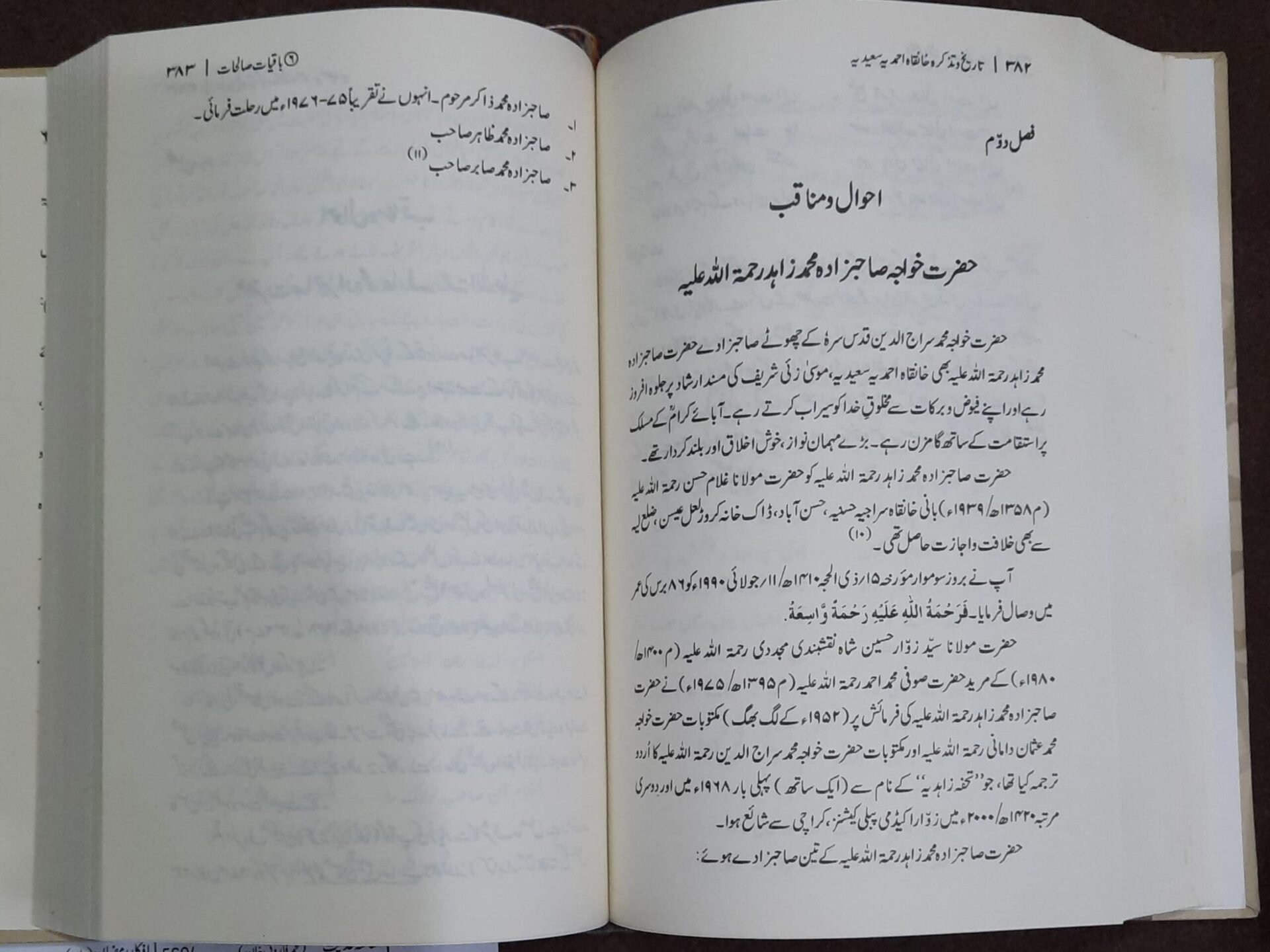خانقا و احمد یہ سعید یہ موسیٰ زئی شریف کے بانی و بانی حضرت حاجی دوست محمد قندھاری ہیں اور اس روحانی تربیت گاہ کے بانی حضرت شاہ ابو سعید مجددی دہلوی اور ان کے صاحبزادے حضرت شاہ احمد سعید مجددی دہلوی اور ان کے بزرگ ہیں۔ فرزند، حضرت شاہ احمد سعید مجددی دہلوی، سام مدنی۔ مہینہ کا فضل شامل ہے۔ لہٰذا اس کتاب کا آغاز قدسیہ کی ان دو ارواح کے بابرکت بیان سے کیا گیا ہے جن کی عقیدت و محبت کی تعمیر کا سرمایہ ہے۔ انشاء اللہ العزیز اس کے بعد قطب زمان حضرت حاجی دوست محمد قندھاری، آپ کے خلیفہ و جانشین ہز ہائینس حضرت خواجہ محمد عثمان دامانی ماہنامہ اور آپ کے پیارے فرزند و جانشین حضرت خواجہ محمد سراج الدین ماہنامہ ہیں، ماہنامہ حالات و امکانات۔ موجود ہیں، جو مقدر ہے۔ حقیقی کا درجہ رکھتا ہے۔ انفاس قدسیہ کے مذکورہ بالا تمام واقعات میں ان کی اولاد اور عظیم خلفاء کا ذکر بھی شامل ہے۔ اسی طرح حضرت خواجہ محمد سراج الدین مین کی امجد میں اولاد ہوئی، حضرت صاحبزادہ حافظ محمد ابراہیم، حضرت صاحبزادہ محمد زاہد پاینے، حضرت صاحبزادہ محمد عارف، اور پھر حضرت حافظ محمد ابراہیم کے صاحبزادے، حضرت صاحبزادہ حافظ محمد ابراہیم، حضرت صاحبزادہ محمد زاہد پایاں اور حضرت حافظ محمد ابراہیم رحمۃ اللہ علیہ کی اولاد ہوئی۔ ، حضرت مولانا۔ جیسا کہ محمد اسماعیل سراجی مجددی اور ان کے فرزند اور خلیفہ ارشد حضرت صاحبزادہ محمد نعمان مدظلہ کے مختصر حالات شامل ہیں۔ نیز حضرت صاحبزادہ محمد سعد سراجی مرشد با باماد ظلہ، مکتبہ سراجیہ اور کتب خانہ خانقاہ شریف کا مختصر تذکرہ ہے۔ قدس سیرت کے روحانی مرجع البحرین کی دوسری شاخ حضرت خواجہ محمد عثمان دامانی کے علاوہ، یعنی ان کے دوسرے صاحبزادے، حضرت خواجہ محمد بہاء الدین رحمۃ اللہ علیہ، ان کے صاحبزادے حضرت خواجہ محمد علاؤالدین معینیہ، ان کے دوسرے صاحبزادے تھے۔ فرزند حضرت خواجہ محمد شمس الدین نقشبندی مجددی وہی ہیں اور ان کے فرزند حضرت مولانا محمد شہاب الدین عثمانی مدظلہ کی ایک کتاب ہے جس میں ذکر خیر بھی شامل ہے۔ بعد ازاں ذیلی خانقاہوں کے تحت بیس روحانی شخصیات کے نام اور نام درج ذیل ہیں۔