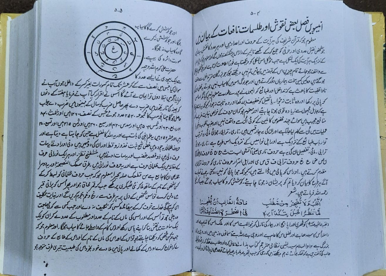روحانی عملیات و تعویزات پر مشتمل ایک ضخیم ، مستند اور قدیم عربی کتاب کا اردو ترجمہ جس میں خواص اسماء الحسنٰی ، اسماۓ عظام،اسم اعظم،قرآن کریم کی سورتوں کے خاص اثرات،حروف کی طاقت،بروج و کوکب،منازل قمر و سیارگان،صنعتِ الٰہی،حجرمکرم،علمِ اکسیر و کیمیا،حروف کے اَسرار و چلہ کشی،حب و تسخیر،آسیب جادو کا توڑ اور ہر ضرورت کے تیر بہدف اعمال درج ہیں،،
