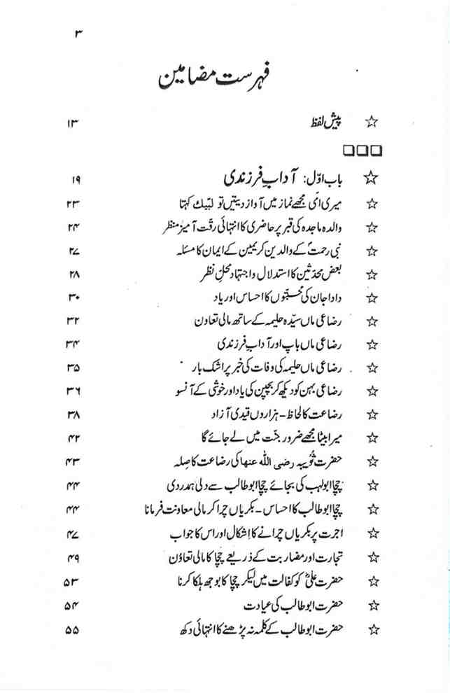 یہ کتاب سات ابواب پر مشتمل ہے باب اول آدابِ فرزندی ، باب دوم بہترین رفیقِ حیات ، باب سوم شفقتِ پدری اور تربیت جیسے موضوعات پر مشتمل ہے