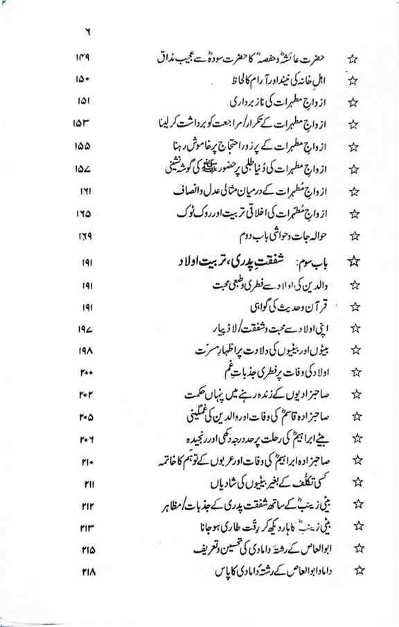 باب چہارم بےساختگی (بےساختہ دعائیں،اعزاز و کلماتِ تحسین) ، باب پنجم رقتِ قلبی باب ششم آبگینہ جذبات اور باب ہفتم لمحاتِ مسرت و فرحت جیسے موضوعات شامل ہیں