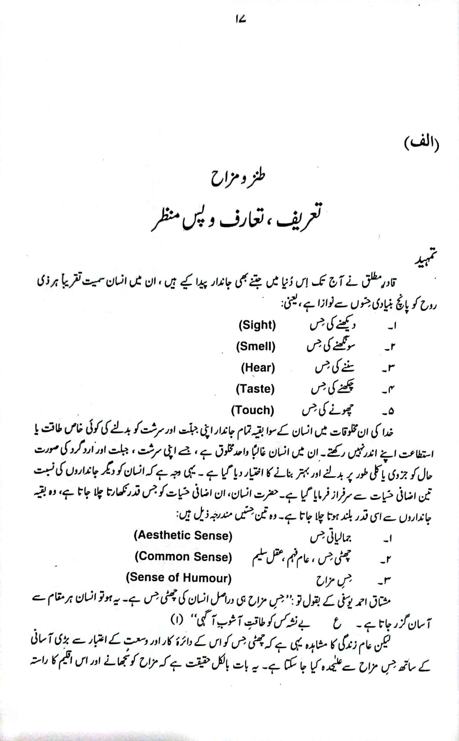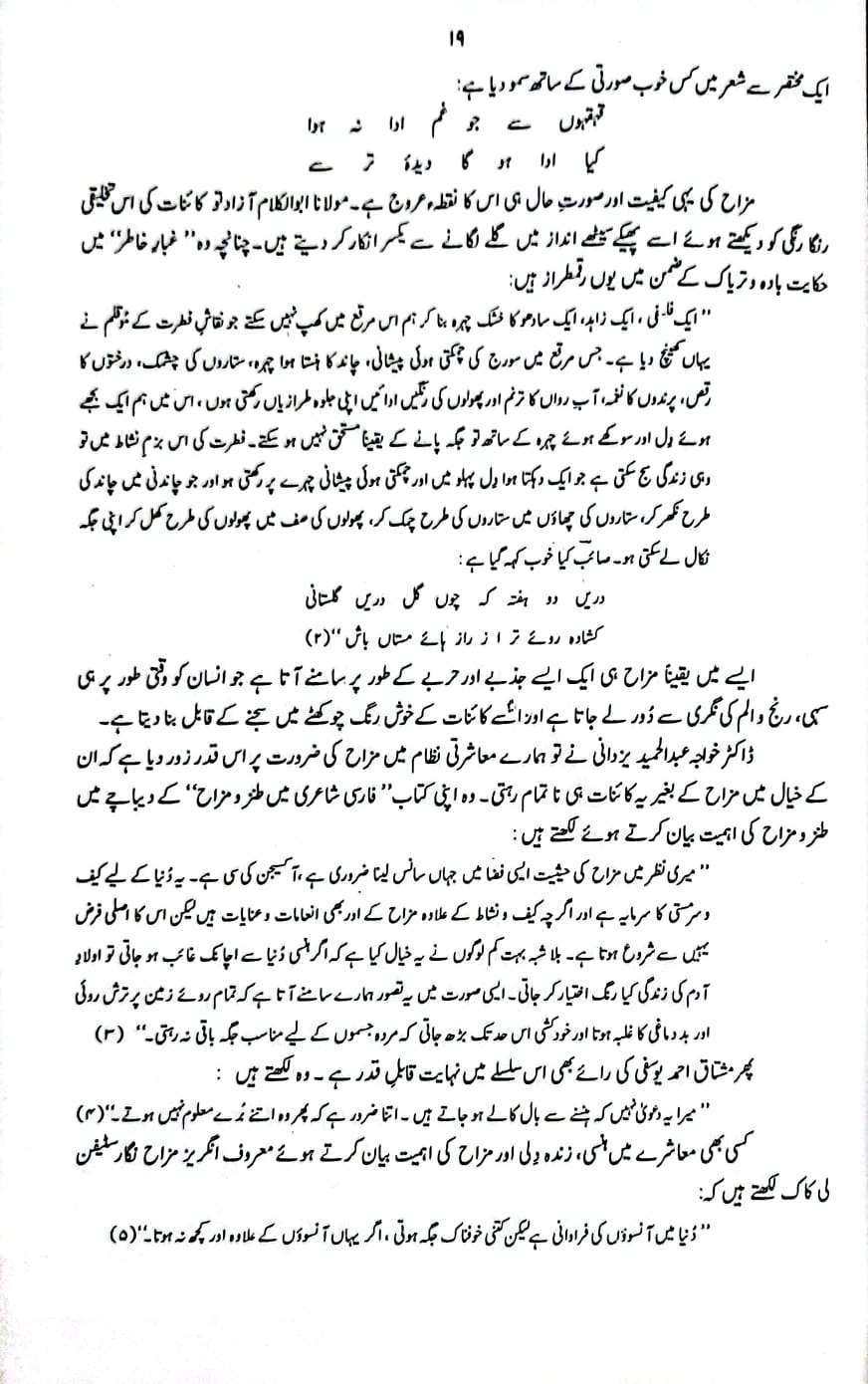 (میرے) “… تحقیقی سلسلے کے نگران جناب پروفیسر ڈاکٹر تحسین فراقی … کی کَڑی نگرانی نے مجھے تحقیقی مزاج سے اس قدر آشنا کر دیا کہ اب تو ‘میاں بیوی’ کے الفاظ ادا کرتے ہوئے بھی ‘بیوی میاں’کہنے کو جی چاہتا ہے کہ ابجد و حالات کا یہی تقاضا ہے۔” (صفحہ 16)