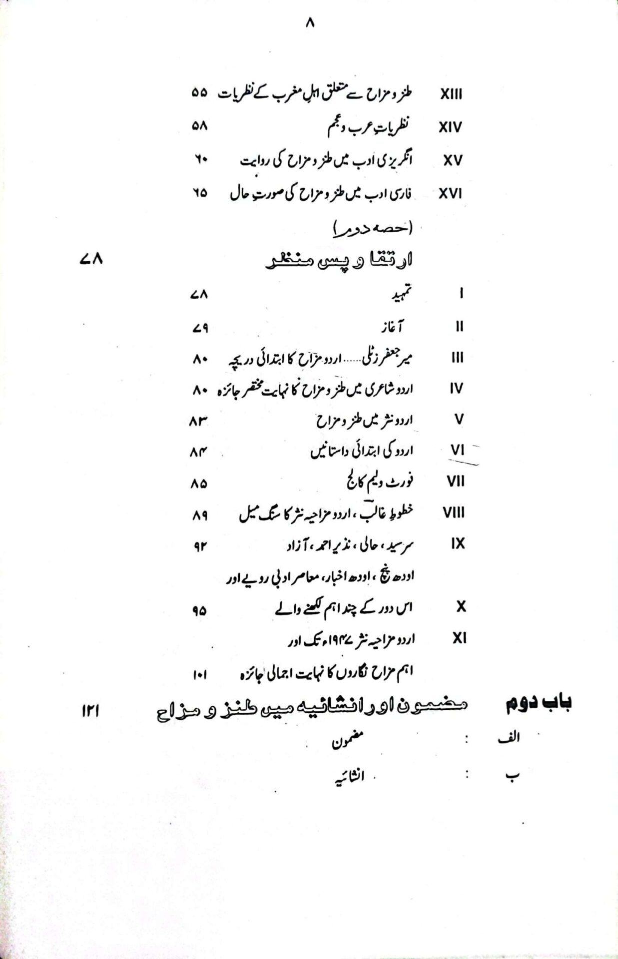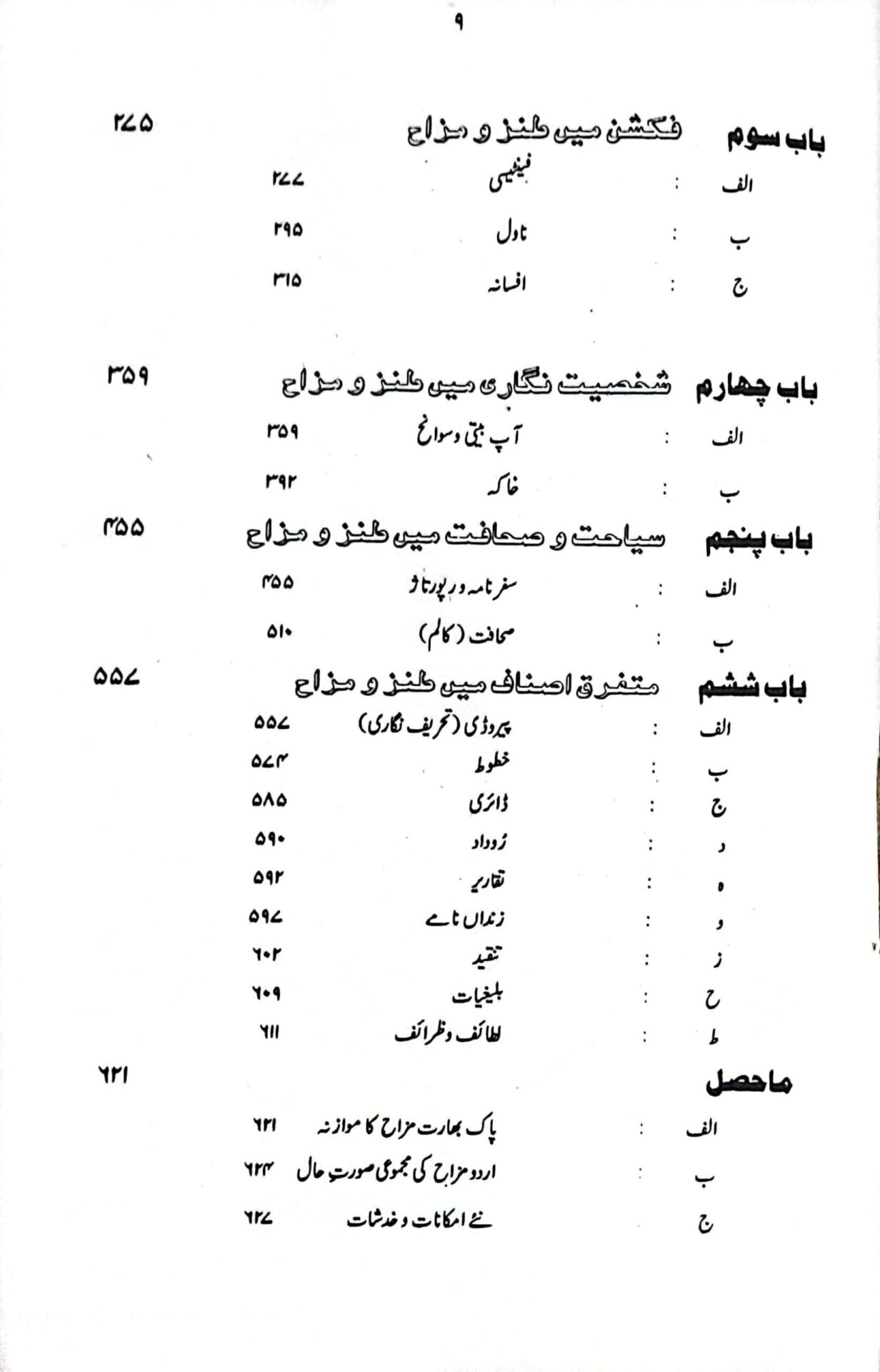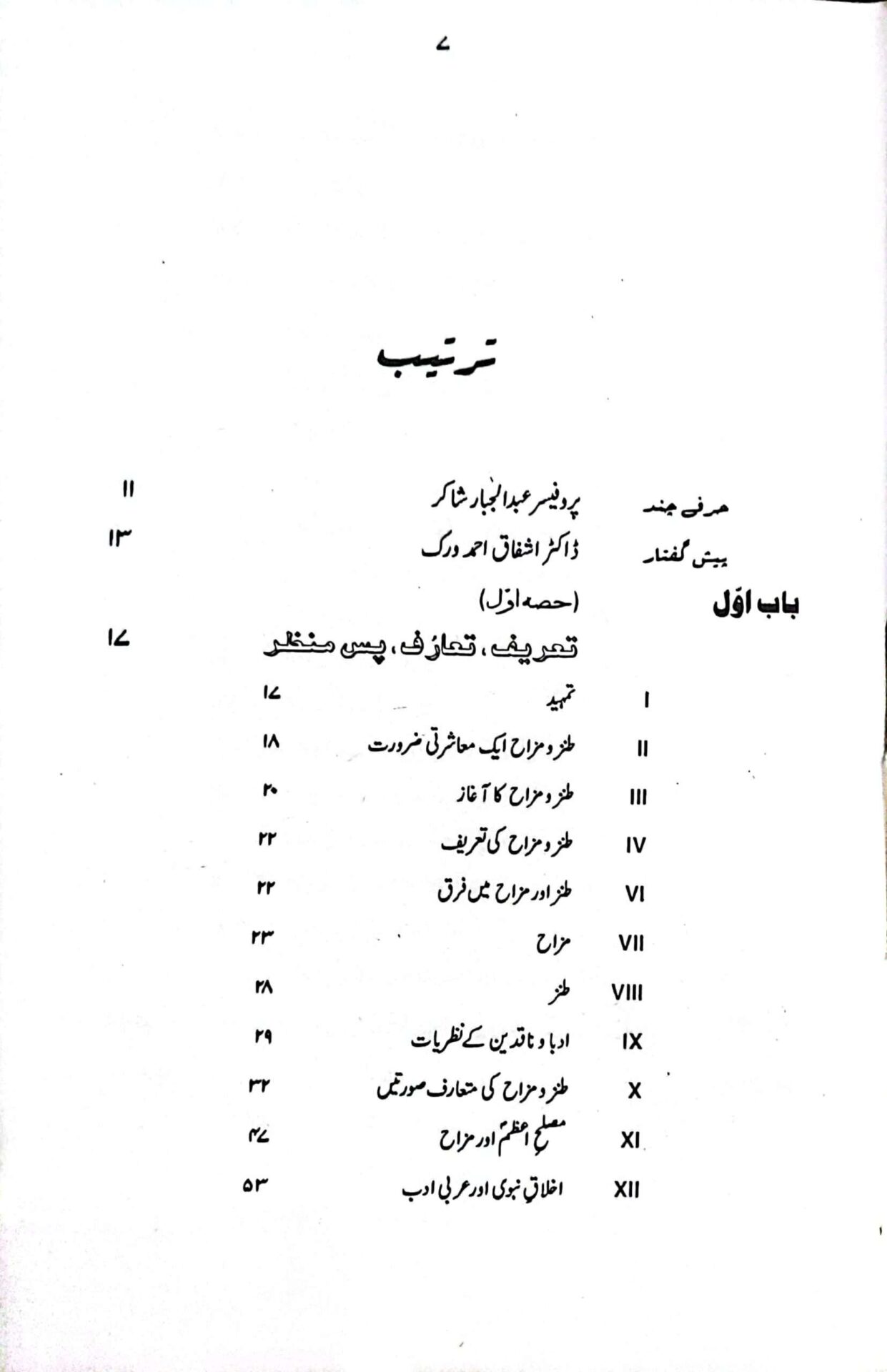 پہلا باب کتاب کے کلیدی ابواب میں سےہے۔ اس میں مصنّف نے طنز اور مزاح کی اصل اور اس سے متعلق دیگر مباحث کو سمیٹنے کی کوشش کی ہے۔ مثال کے طور پر: طنز و مزاح ۔۔ ایک معاشرتی ضرورت، طنز اور مزاح میں فرق، طنز و مزاح کی متعارف صورتیں۔ اس کے علاوہ طنز و مزاح کی تعریف، آغاز اور ان کے مابین فرق، عرب و عجم و مغرب میں طنز اور مزاح کے نظریات اورعربی، فارسی، انگریزی میں طنز و مزاح کی روایت کا اجمالی جائزہ اس باب کے دیگر مباحث ہیں۔ باقی پانچ ابواب میں مصنّف نے صِنف وار اُردو کے طنزیہ و مزاحیہ اَدب کا مفصّل تعارف اور اس پر اپنا تجزیہ پیش کیا ہے۔ ان اَصناف کی فہرست ملاحظہ کرنے سے اندازہ ہوتا ہے کہ اشفاق وِرک نے ہر اُس صِنف کو اپنی بحث کے دائرے میں لے لیا ہے جس میں کوئی قابلِ ذکر طنزیہ و مزاحیہ تحریرموجود ہے۔ فہرست ملاحظہ ہو: