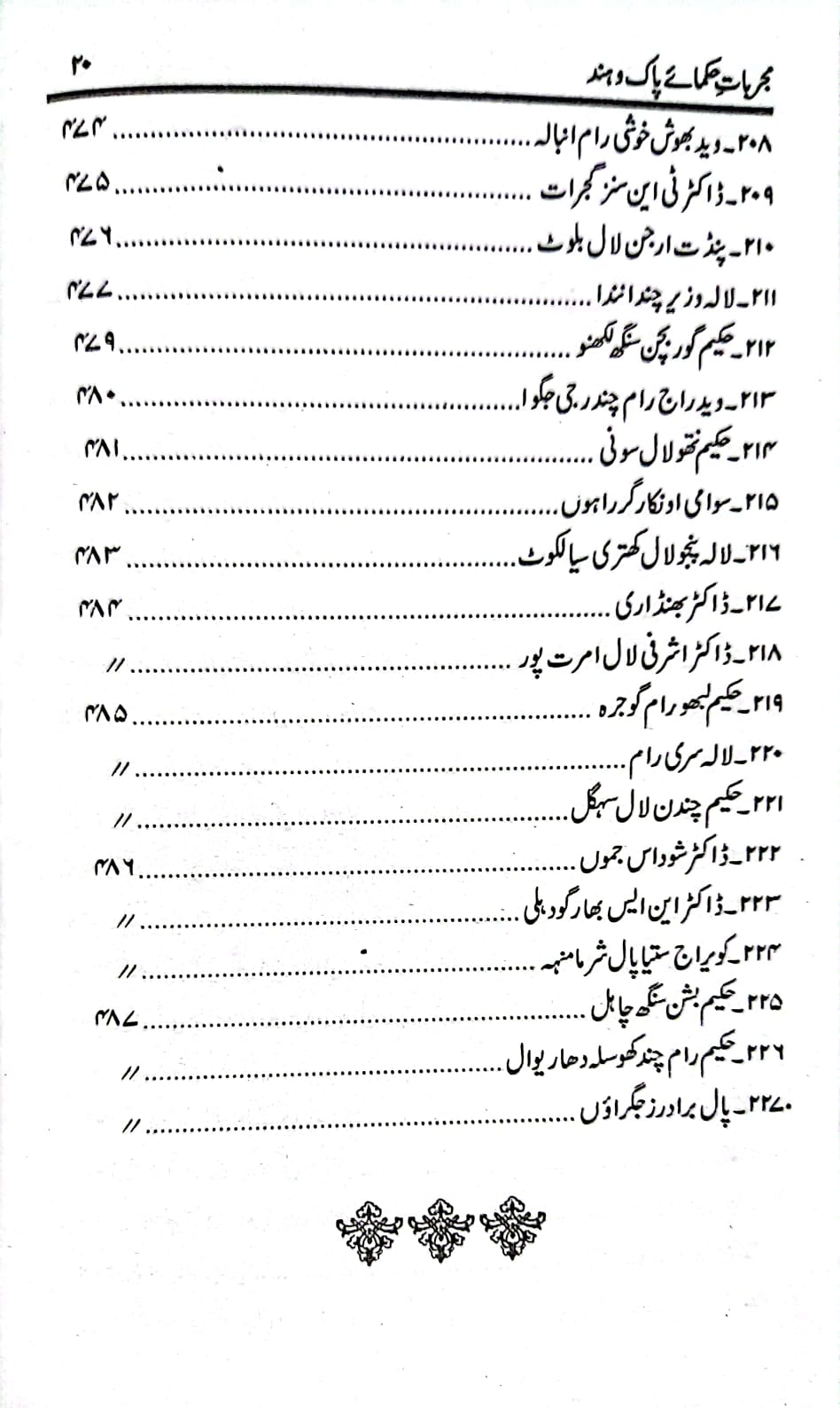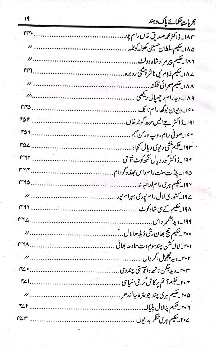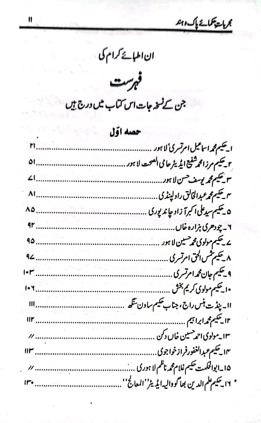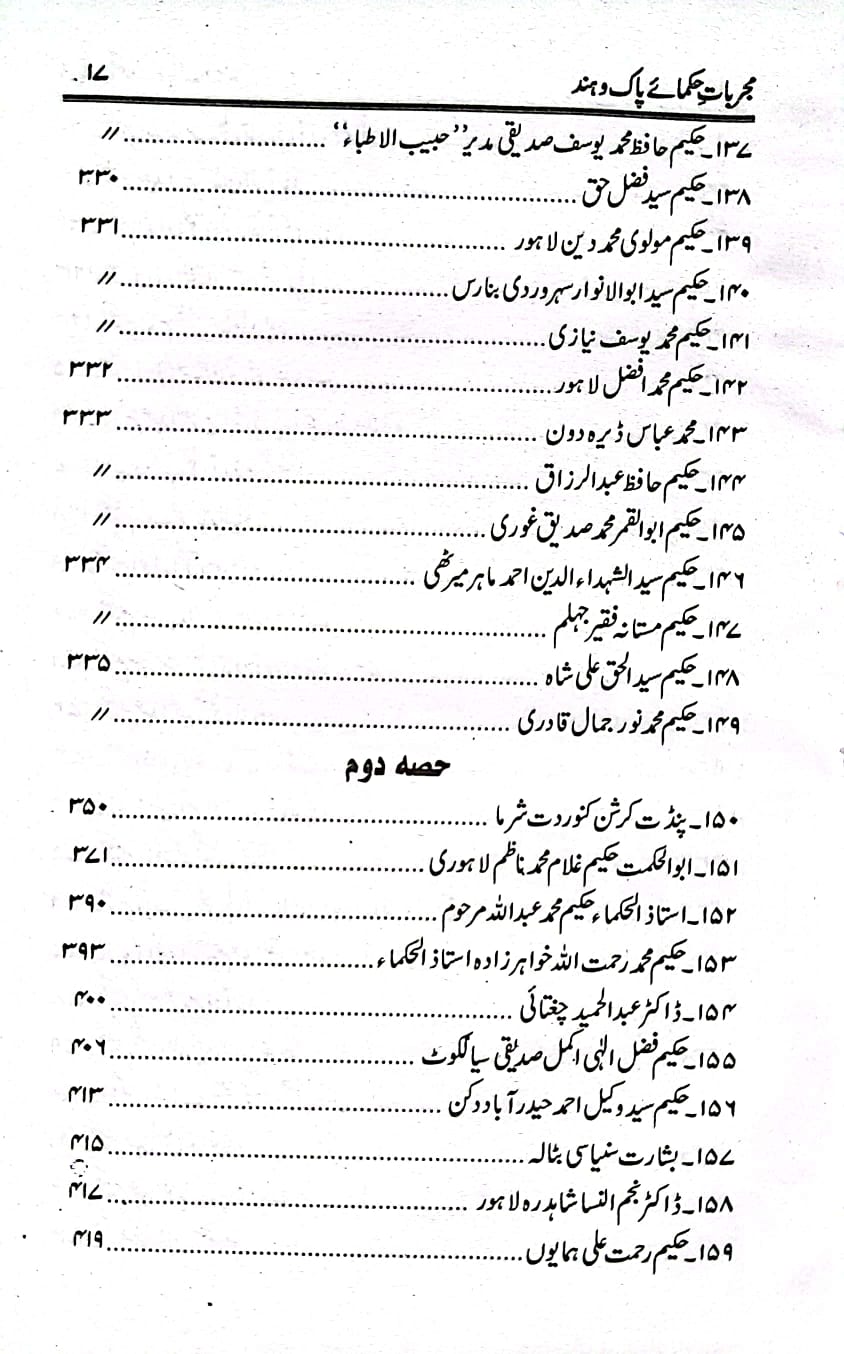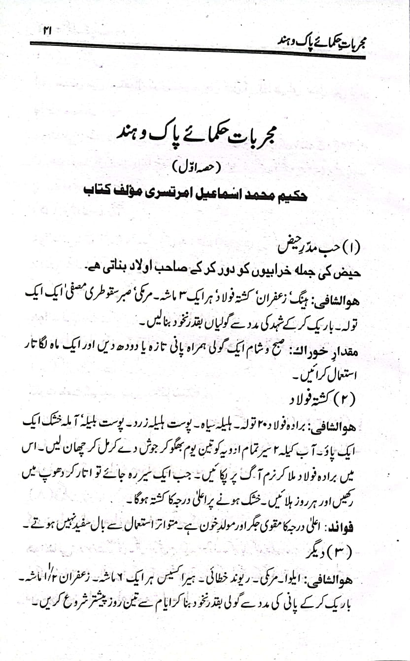 مجربات حکمائے پاک و ہند (ابوالسنیاس حکیم محمد اسمٰعیل امرتسری) برصغیر پاکستان و بھارت کے دو سو (۲۰۰)سے زائد اطبا کے دو ہزار سے زیادہ مجرب اور آزمودہ نسخہ جات اس کتاب میں درج ہیں۔ اس کے علاوہ اسرار نبض اور تشخیصی رموز پر بھی علیحدہ ابواب ہیں جن کے مطالعہ سے مریض کو دیکھ کر ہی مرض کی شناخت اور تشخیص کی جا سکتی ہے۔ یہ کتاب برصغیر کے دو مشہور طبی جریدوں ’’آب حیات‘‘ اور ’’حامی الصحت‘‘ کی فائلوں سے مرتب کی گئی ہے۔ جو اب کسی قیمت پر بھی دستیاب نہیں ہیں۔ ان کے علاوہ حکیم محمد اسمٰعیل صاحب نے ۱۹۷۶ء تک اپنے آزمودہ نسخہ جات درج کر دیے ہیں۔ پاکستان و ہندوستان کے معروف اور نامور حکماء کے تیر بہدف نسخہ جات اس کتاب میں آپ کو یک جا ملیں گے۔